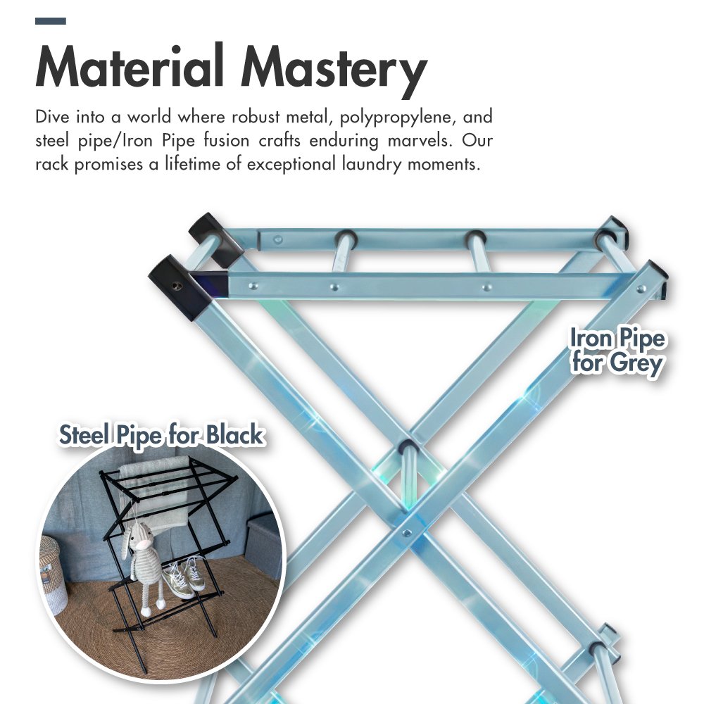 At the heart of our collection’s unbeatable functionality is its superb construction. By harmonising premium materials such as metal. polypropylene. and steel pipe. we’ve sculpted a drying rack built to endure. And with those nifty anti-slip capped legs. you’re assured your prized clothes remain where you left them. all whilst your floors remain pristine.