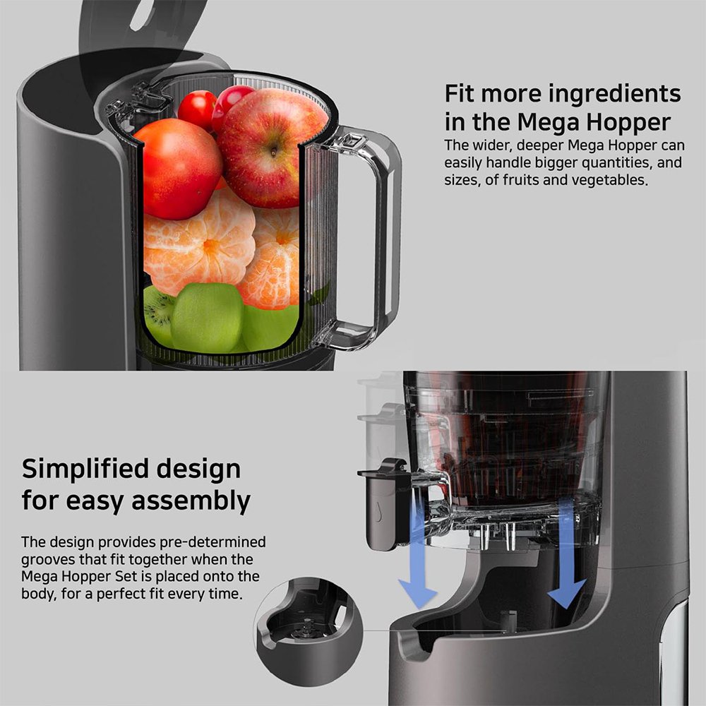 Self-Feeding Hopper:Â The H400 Slow Juicer comes with the highest volume of any self feeding hopper yet. This change is complimented by a larger opening. and a larger inlet to add more ingredients while the juicer is still running.