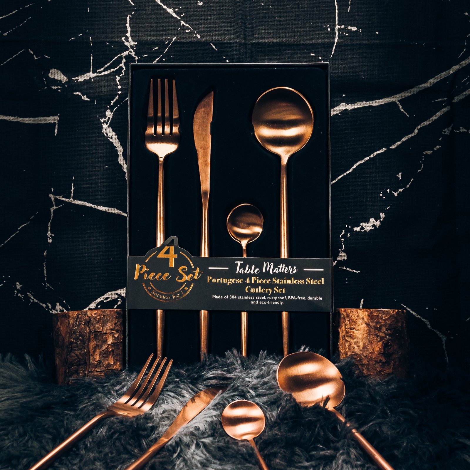 Discover the perfect symbiosis of function and form with our collection. With choices that allow your personality to shine through your table setting. you have the creative freedom to craft a dining ambience that resonates with elegance and sophistication. Choose the “Portuguese 4 Piece Stainless Steel Cutlery Set in Rose Gold”. and grant yourself the luxury of a sublime dining experience where every detail is a tribute to quality and style. Remember. in the world of dining. your table matters!