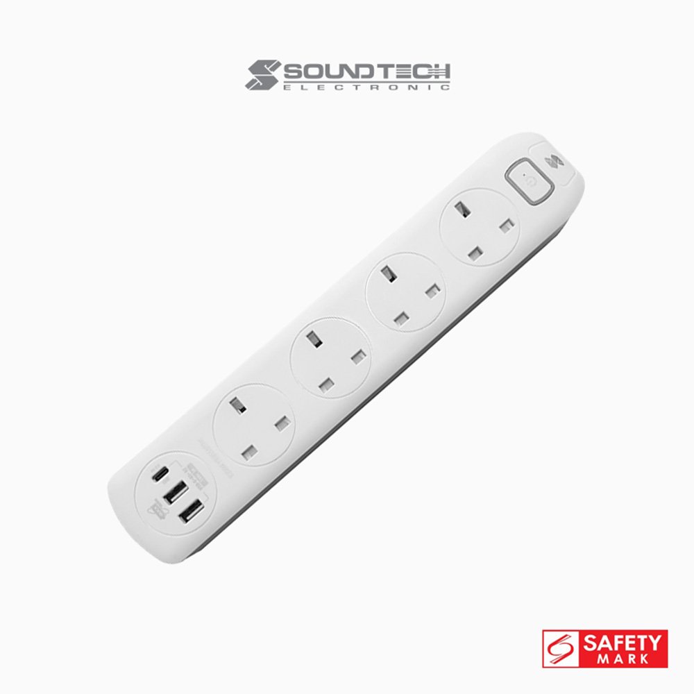 SOUNDTECH – 4Ways 2Metres Extension Socket with USB A+C. BLACK | WHITE